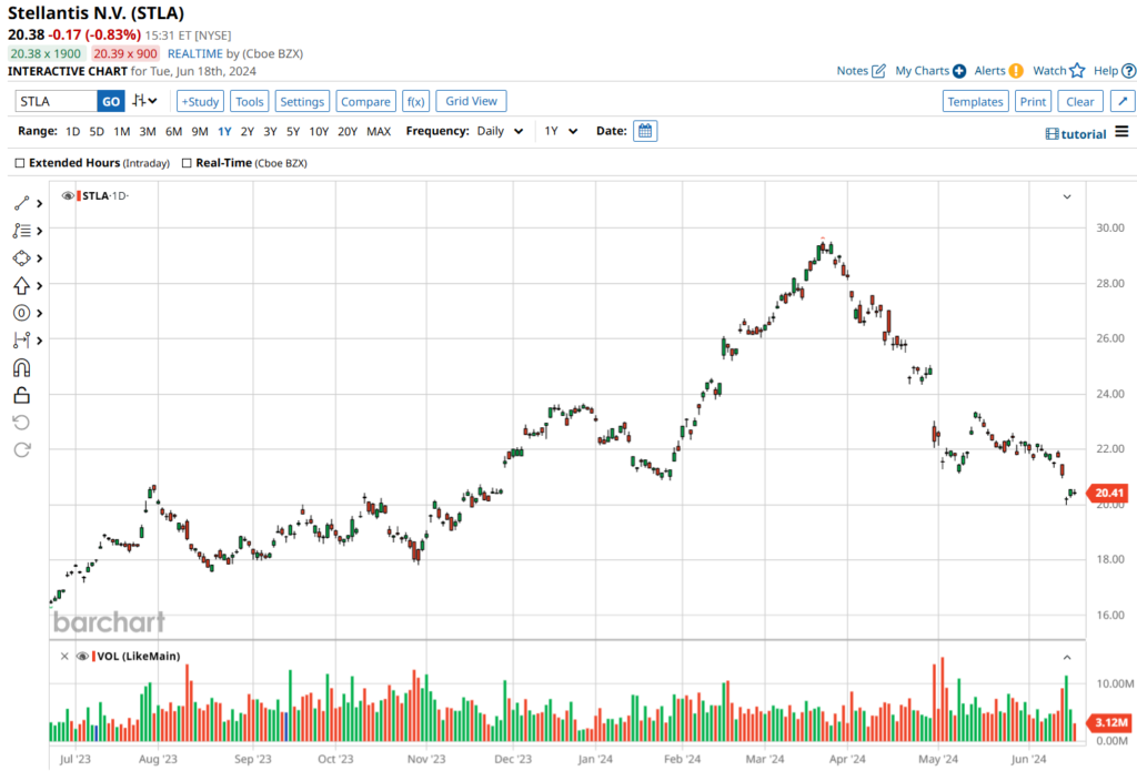 Despite experiencing notable volatility in its stock price in recent months, Stellantis exhibits resilience. While the stock saw a 30% pullback from its peak in March, it maintains a 21% increase over the last 52 weeks despite being down 12% YTD.