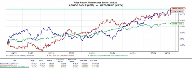 Thanks to their strengthening earnings outlook, Agnico and Matson’s stock have soared +56% and +39% in 2024 respectively. Noticeably outperforming the S&P 500 this year, AEM and MATX are now up over +100% in the last two years to impressively top the benchmark’s +53%.