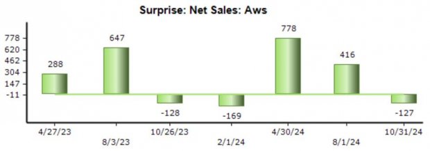 A big highlight of the results was the AWS results. AWS sales jumped 19% year-over-year to $27.5 billion, matching the same growth pace reported last quarter. The AWS results modestly fell short of our consensus estimate, as shown below.