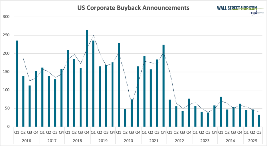 Wall Street Horizon saw a 10-year low in the number of companies announcing buyback plans in Q3.