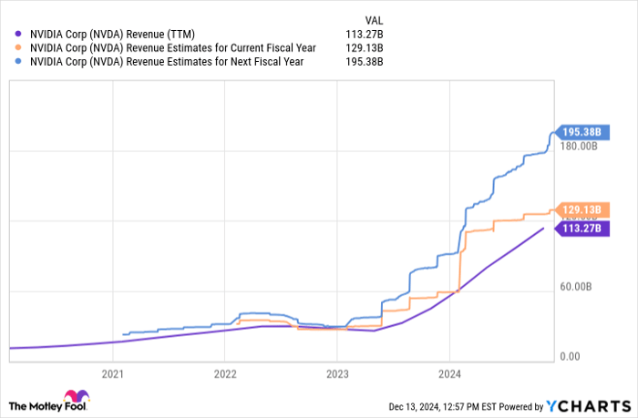 That launched Nvidia into hyper-growth mode, and its next-generation chips are poised to be just as successful. The reality is that AI requires immense computing resources, and the need grows as models become more advanced and more companies want to deploy AI applications. You can see that Nvidia’s business remains on an upward trajectory, with analysts estimating that it will generate nearly $200 billion in revenue next fiscal year: