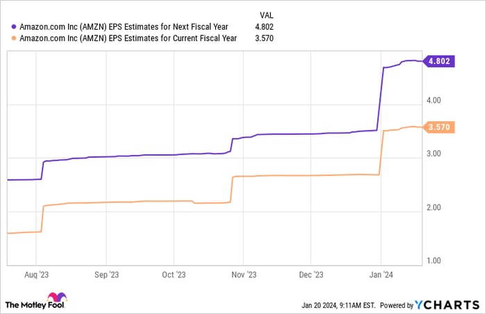 Despite the bullish 2023, Amazon’s stock still lingers approximately 17% below its peak in July 2021. This figure underscores the untapped potential for stock appreciation in the fresh year. Projections for earnings per share (EPS) are even more sanguine.
