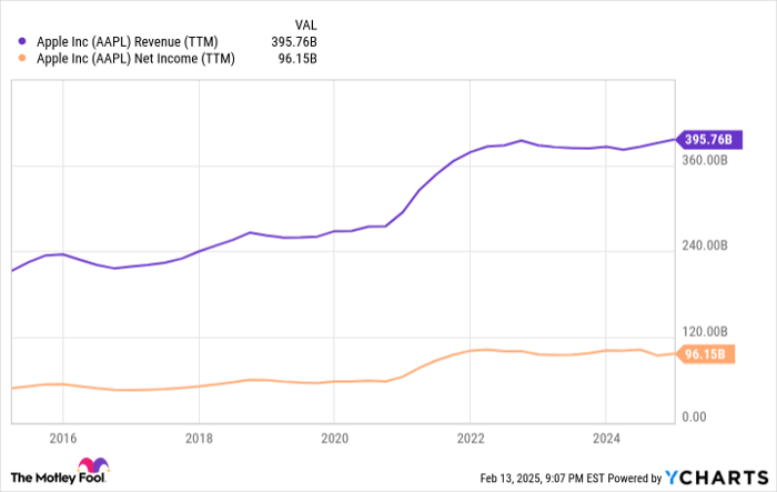 Sure, say what you want about Apple’s slowing growth before the COVID-19 pandemic, and outright stagnation since its sales peak in 2022. Net income hasn’t really grown any since then either. Blame the iPhone, mostly, which still accounts for about half of Apple’s total revenue.
