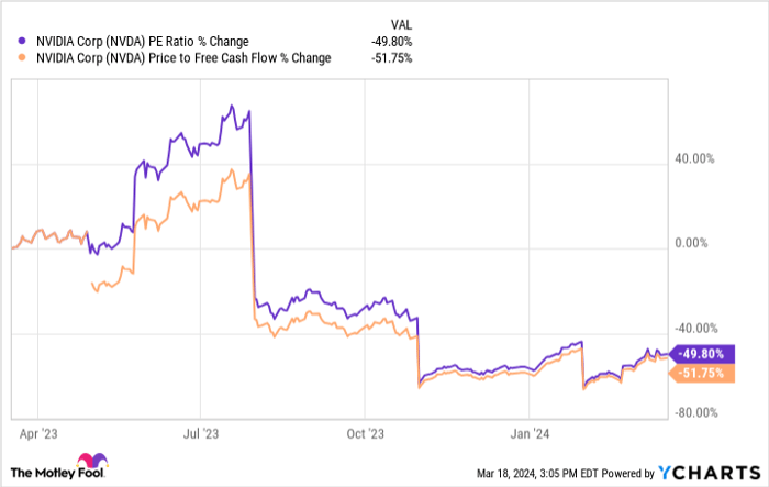 Amidst soaring stock prices, Nvidia’s stock continues to gain value. The price-to-earnings (P/E) and price-to-free-cash-flow ratios have both plunged in the past year, positioning the stock as one of the best-valued in 12 months.