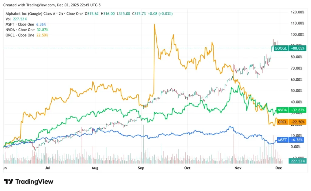 Investors have certainly taken notice—just look at GOOGL’s outperformance relative to other stocks in the OpenAI universe, especially Oracle (NYSE:).