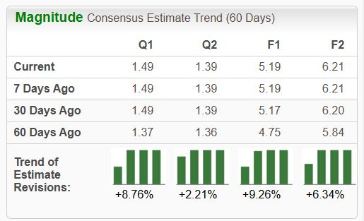 Earnings expectations across the board have moved higher for the mega-cap giant, reflecting an optimistic outlook from analysts. The $5.19 Zacks Consensus EPS estimate suggests nearly 80% growth year-over-year, with the stock also sporting a bullish Zacks Rank #2 (Buy).