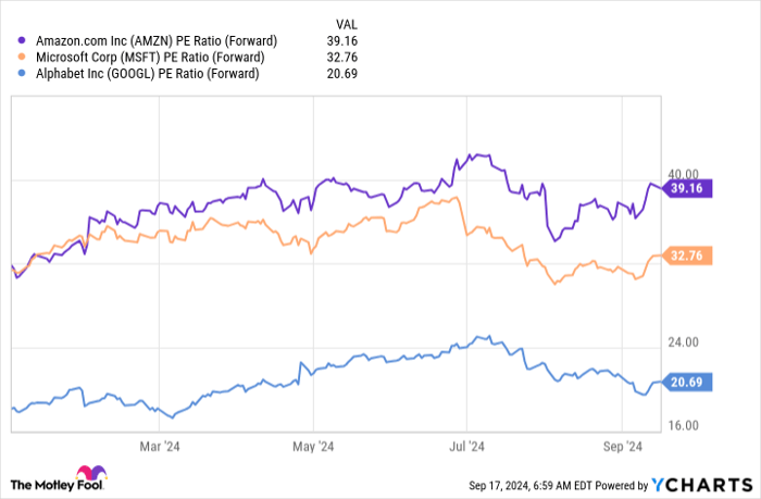 Last is Alphabet, which is actually cheaper than the broader market (measured by the S&P 500, which trades at 22.7 times forward earnings). Alphabet doesn’t have the premium valuation of its peers because it has been behind on several key product launches, but that doesn’t mean it can’t be a solid investment. Alphabet has much to gain from its cloud computing wing because it is just starting to turn profitable and could be a huge boost to profits as it moves toward AWS-like margins.