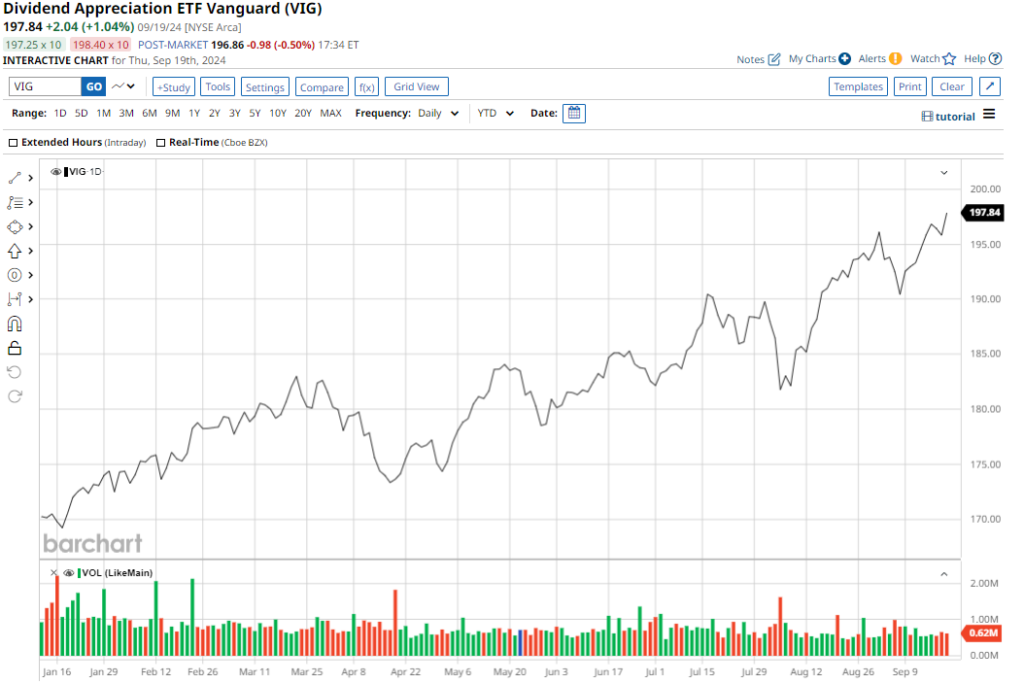 Up 15.6% on a YTD basis, the VIG ETF offers a forward dividend yield of 1.71%, backed by a 5-year growth rate of over 10%.