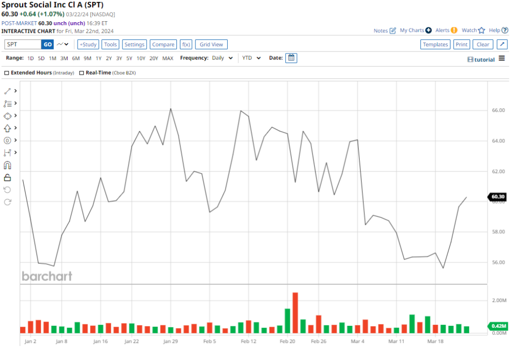 Sprout Social (SPT) unfurls a social media management software realm for businesses. With a $3.4 billion market cap, Sprout weaves its magic in managing social media footprints across platforms. Despite a modest 3.5% YTD dip, analysts extol Sprout’s prime spot in social media domain and AI infusion igniting its operations.