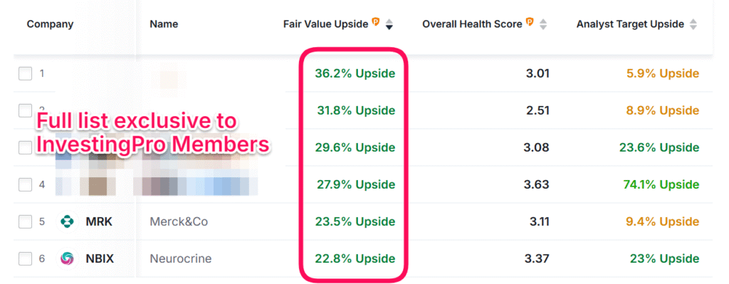 We can see that these pharmaceutical stocks are undervalued by between 22.8% and 36.2% according to InvestingPro Fair Value.