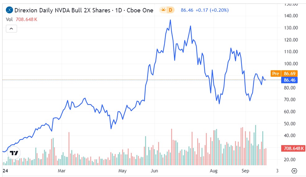 Direxion, a renowned provider of financial products, offers compelling leveraged ETFs backed by instruments like swaps and futures contracts. The Direxion Daily NVDA Bull 2X Shares (NVDU) aims for 200% daily performance of Nvidia shares, while the Direxion Daily NVDA Bear 1X Shares (NVDD) seeks 100% inverse performance.