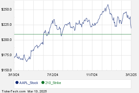 Below is a chart showing the trailing twelve month trading history for Apple Inc, and highlighting in green where the $210.00 strike is located relative to that history: