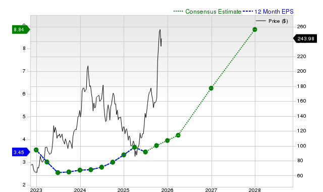 For the next fiscal year, the consensus earnings estimate of $5.18 indicates a change of +52% from what Advanced Micro is expected to report a year ago. Over the past month, the estimate has changed -0.1%.