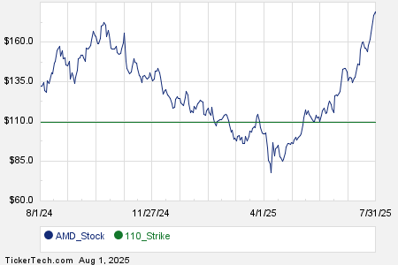 The chart above, and the stock’s historical volatility, can be a helpful guide in combination with fundamental analysis to judge whether selling the December 2027 put at the $110 strike for the 4.8% annualized rate of return represents good reward for the risks. We calculate the trailing twelve month volatility for Advanced Micro Devices Inc (considering the last 250 trading day closing values as well as today’s price of $171.45) to be 51%. For other put options contract ideas at the various different available expirations, visit the AMD Stock Options page of StockOptionsChannel.com.