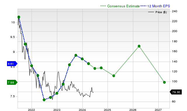 The consensus earnings estimate for the ongoing fiscal year is $8.20, indicating a year-over-year downturn of -4.9%. This estimate has declined by -1.4% in the past month.