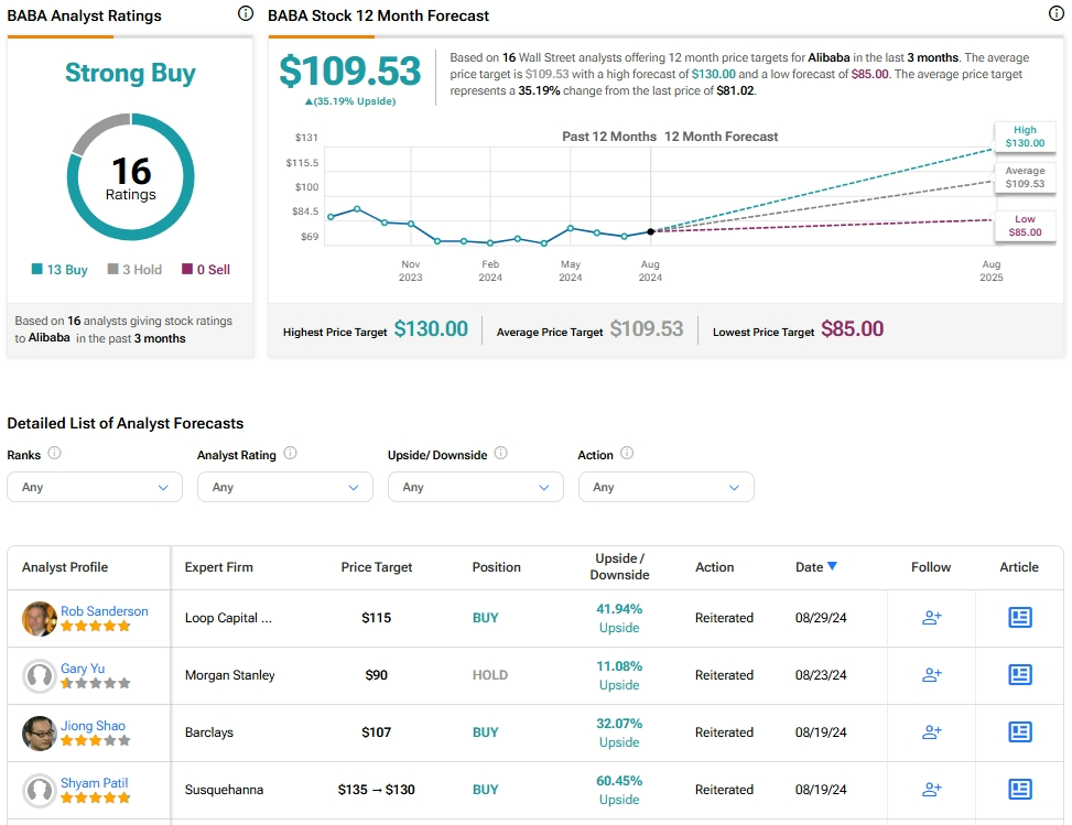 Analysts maintain an optimistic outlook on BABA stock, with a Strong Buy consensus based on 13 Buy ratings and three Holds. Over the past year, BABA has witnessed a decline of over 10%, while the average price target stands at $109.53, projecting a potential upside of 35.2% from current levels.