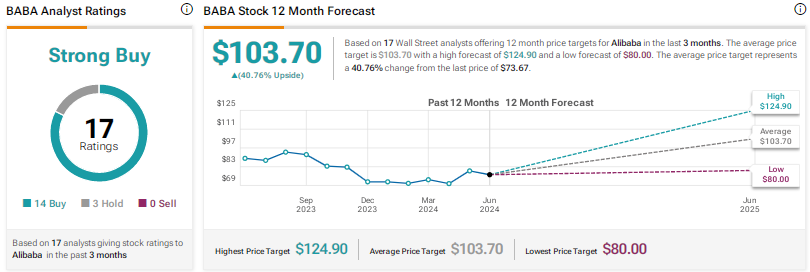 Wall Street echoes this sentiment with 14 Buy and three Hold ratings, labeling Alibaba stock a Strong Buy. The average BABA stock price target of $103.70 promises a 41% upside potential, further kindling optimism among investors.