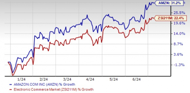 In a year marked by seismic shifts, Amazon’s AMZN shares have surged by an impressive 31.2% year-to-date, surpassing the Internet Commerce industry’s return of 22.4%. Central to this rise is the e-commerce titan’s cloud computing arm, Amazon Web Services (AWS), which has witnessed robust momentum.