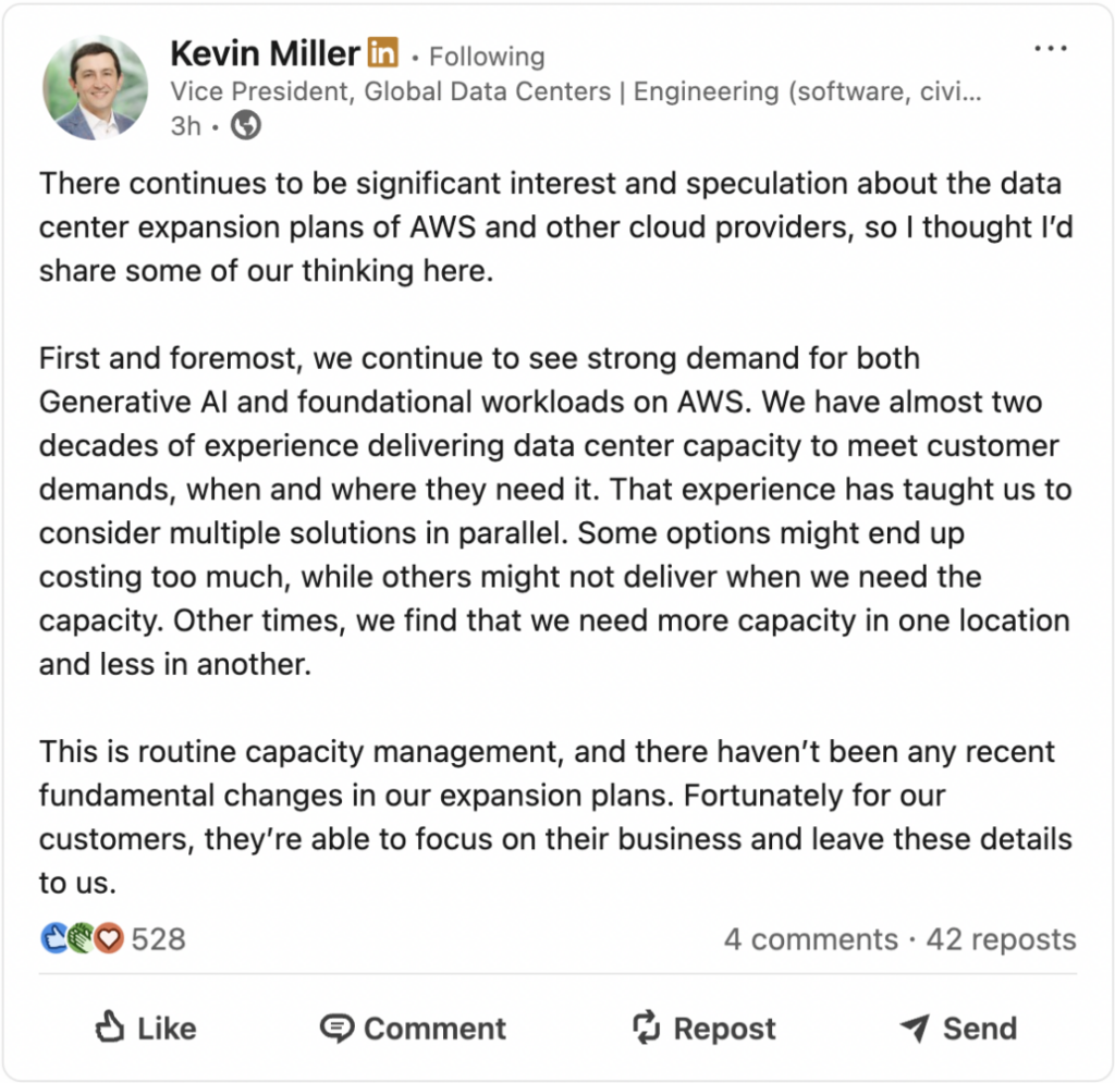 “This is routine capacity management, and there haven’t been any recent fundamental changes in our expansion plans,” said Kevin Miller, vice president of Amazon Web Services (AWS) Global Data Centers, in a LinkedIn post, first noted on Reuters.