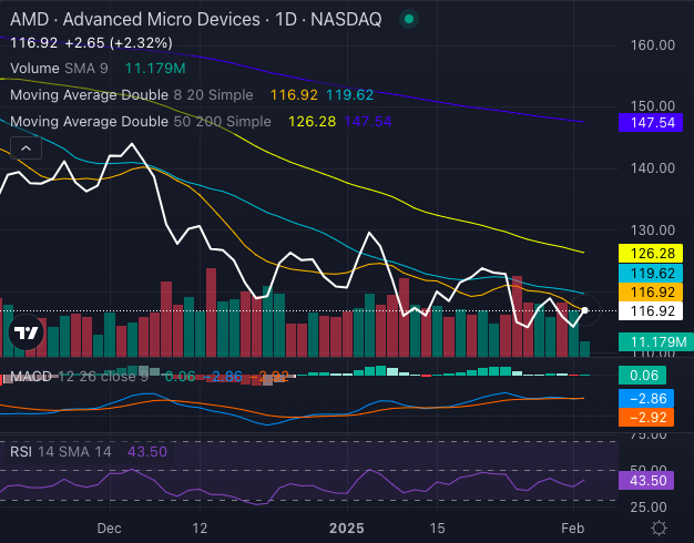 Technically, AMD stock is flashing multiple sell signals as it trades below its eight-day, 20-day, 50-day and 200-day simple moving averages, reinforcing downward momentum. The Moving Average Convergence Divergence (MACD) sits at a negative 2.86, and a Relative Strength Index (RSI) of 43.50 suggests AMD stock is nearing oversold territory.