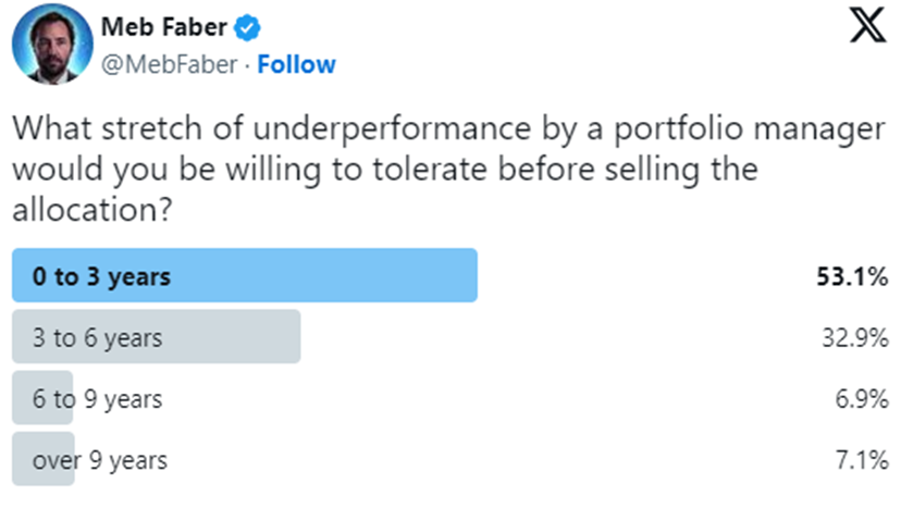 Would you have stayed loyal to Buffett amidst this underperformance, or succumbed to doubts about his prowess? Meb Faber poses a crucial query – enduring 15 years of underperformance against a neighbor’s soaring portfolio of “hot stocks.”