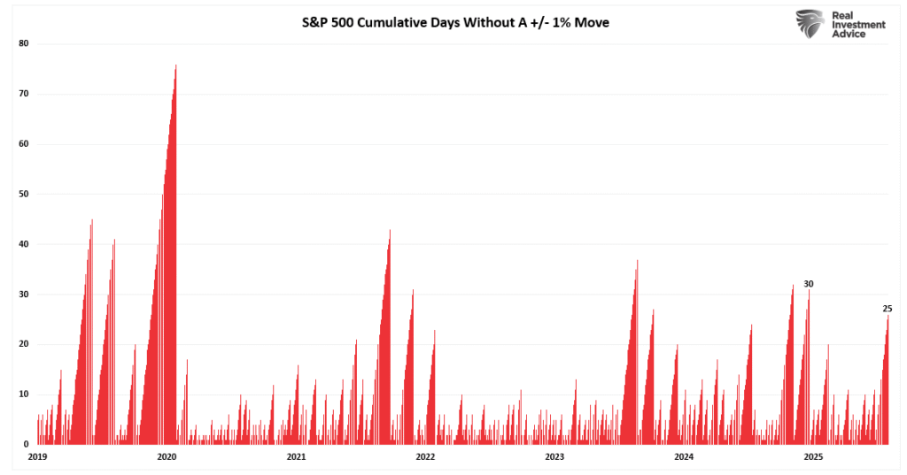 “While stretches have previously been longer, a consideration of such an event is that low volatility tends to beget high volatility. These “buying stampedes” typically last on average about 15 trading days, so at 25 and counting, we are certainly pushing a more extended duration.”
