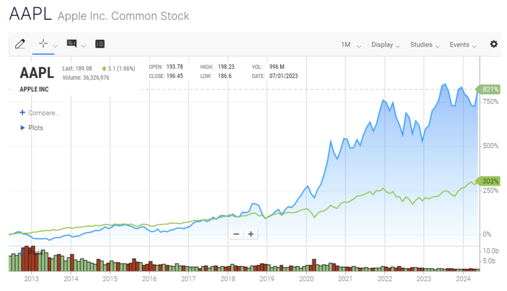 An exemplar of unwavering faith is Apple (AAPL). Through a dozen years of tumult, the bullish drumbeat on Apple has persisted unequivocally in my writings and personal investment choices. Countless critics have lambasted the tech giant, predicting its demise. Yet, a simple visual comparison of AAPL to the S&P 500 tracking ETF, SPY, over the past decade emphasizes the fallacy of such harbingers of doom.