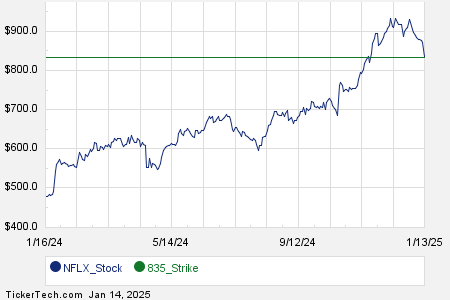 Below is a chart showing the trailing twelve month trading history for Netflix Inc, and highlighting in green where the $835.00 strike is located relative to that history: