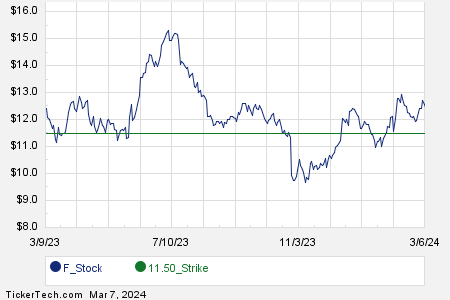 On the flip side, a call contract situated at the $13.00 strike price presents an interesting proposition with a current bid of 33 cents. Engaging in a “covered call” strategy by selling this call contract alongside owning Ford shares at $12.41 may lead to a compelling return of 7.41% if the stock is called away at expiration.