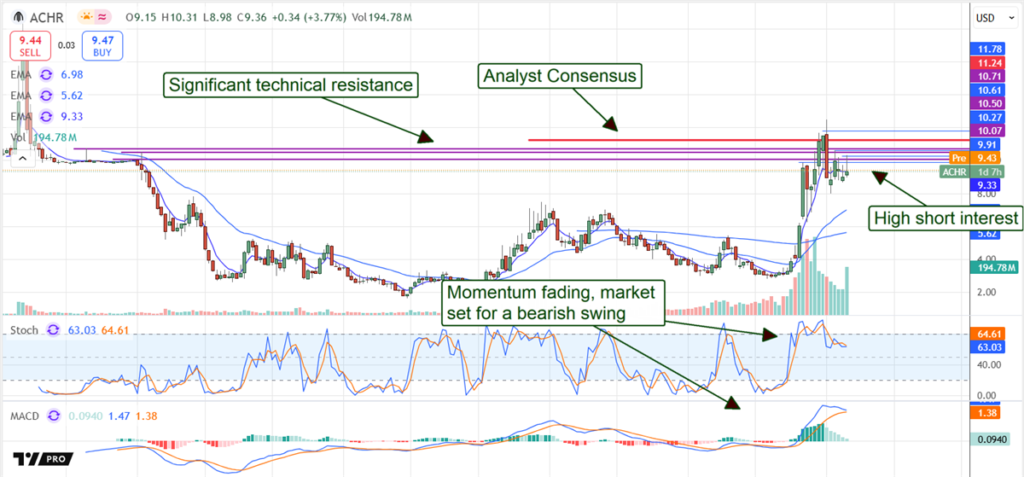The daily charts of Archer Aviation’s stock price action are promising, showing a strong upswing and potential for a bullish momentum swing that could take it to new highs. However, the weekly charts present numerous hurdles and a high potential for price pullbacks. The hurdles align with previous price peaks, including those dating back to shortly after the IPO in 2021. They also align with the analyst’s consensus price target, which means a move to the consensus may not get much higher. The risk is that short-sellers will pile into the stock at this level and drive it down to critical support targets at $8 or lower.