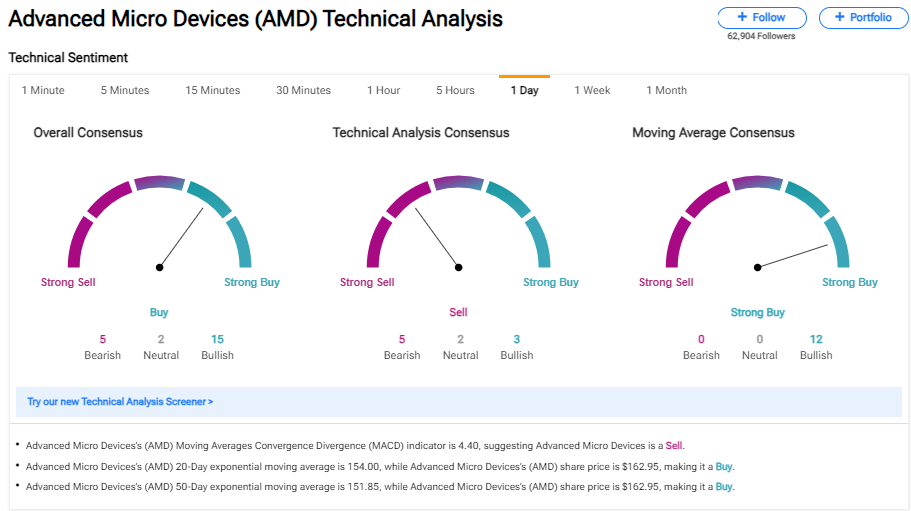 Recent technical analysis unveils a mixed sentiment towards AMD’s stock, with moving averages signaling a constructive outlook. AMD’s shares currently outperform their 50-day and 200-day moving averages, further corroborated by the recent golden cross marked by the 50-day Simple Moving Average (SMA).