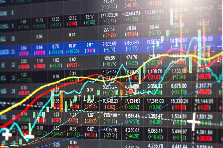 Business man on stock market financial trade indicator background. Man analysis stock market financial trade indices on LED. Double exposure of business man trade on stock market financial concept.