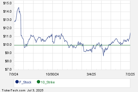 Below is a chart showing the trailing twelve month trading history for Ford Motor Co., and highlighting in green where the $10.00 strike is located relative to that history: