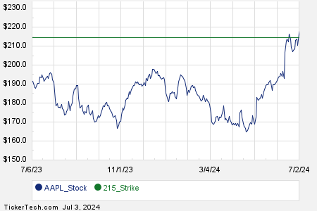 Charting the trailing twelve-month trading history for Apple Inc illustrates the $215.00 strike’s position within that context.