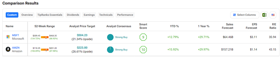 Utilizing the TipRanks Stock Comparison tool, we compared Amazon.com and Microsoft. Both companies hold a “Strong Buy” consensus rating on Wall Street. With outstanding scores of above eight, they are poised to exceed expectations.