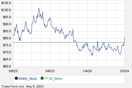 The put contract at the $80.00 strike price boasts a current bid of $9.00. By selling-to-open this put contract, an investor commits to buying the stock at $80.00 but also receives the premium, reducing the cost basis of the shares to $71.00 (before broker commissions). This might be an appealing alternative for investors eyeing BABA shares, considering a current price of $80.76 per share.
