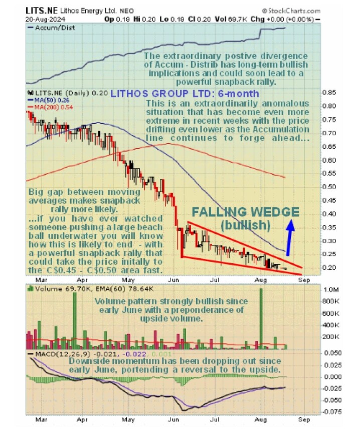 Lithos Group Ltd. closed at CA$0.20, US$0145 on August 20, 2024.