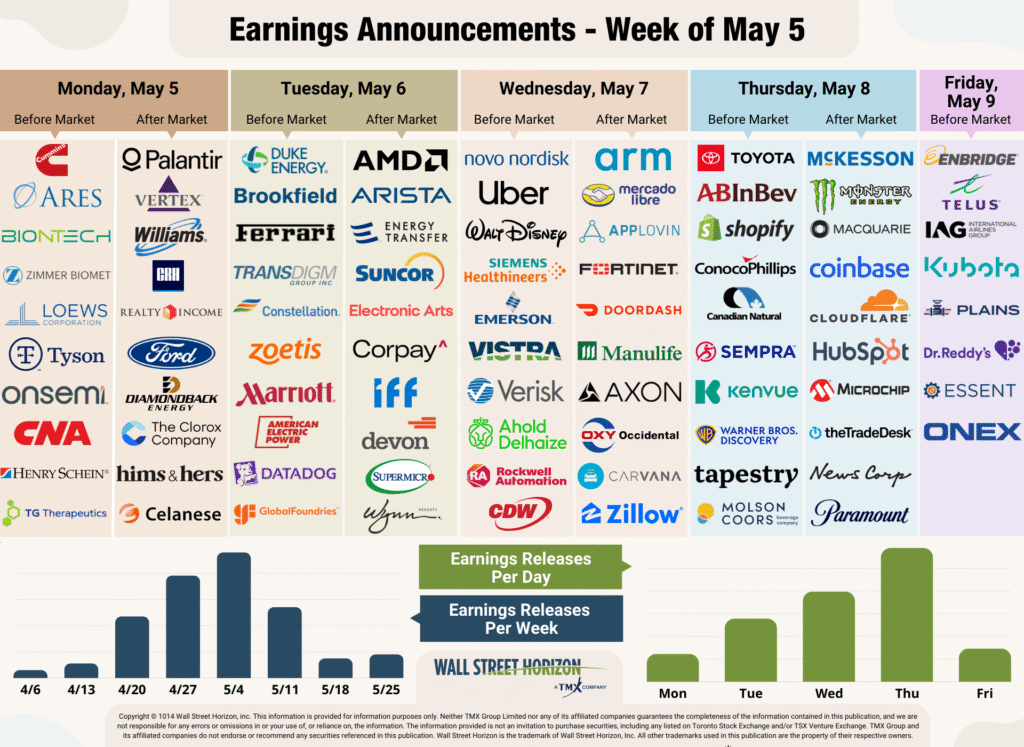 The second week of peak earnings season begins this week and continues until May 16, with each week expected to see over 2,000 reports. Currently, May 8 is predicted to be the most active day with 1,174 companies anticipated to report. Thus far, only 70% of companies have confirmed their earnings date (out of our universe of 11,000+ global names), so this is subject to change. The remaining dates are estimated based on historical reporting data.Q1 2025 Earnings Season