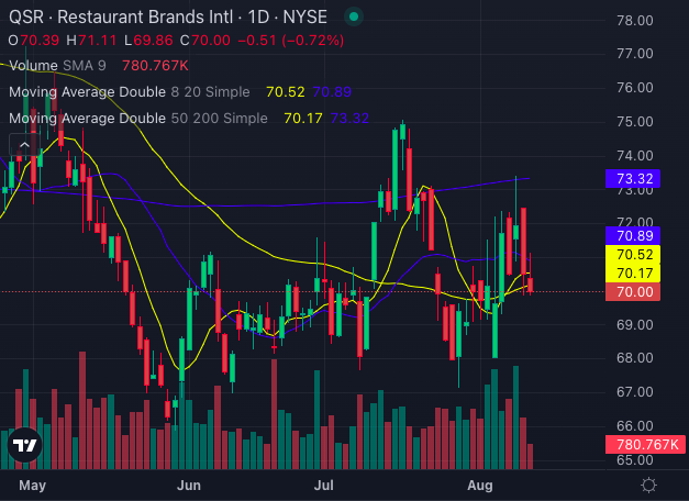 Restaurant Brand’s current share price of $70 languishes beneath its five-, 20-, and 50-day moving averages, hinting at a palpably bearish sentiment with a hint of selling pressure.