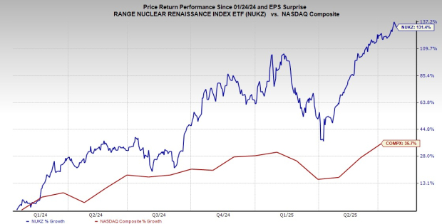 Along with GEV, nuclear standouts Constellation Energy, Talen, Rolls-Royce, NuScale, and others have crushed the market in the last year. The Range Nuclear Renaissance Index ETF (NUKZ), which holds these stocks, along with many others, has climbed 130% since its debut in January 2024 to blow past the Nasdaq’s 36%.