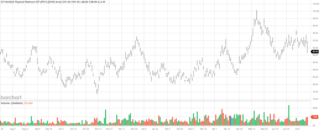 Despite the factual evidence surrounding platinum usage, Wall Street remains wary of catalytic converter and platinum demand. Consequently, PPLT has experienced minimal movement, with a slight decline of around 1-2% over the past year and a 3% slump year-to-date, offering investors a chance to enter the market at the mid- to upper $80 range.