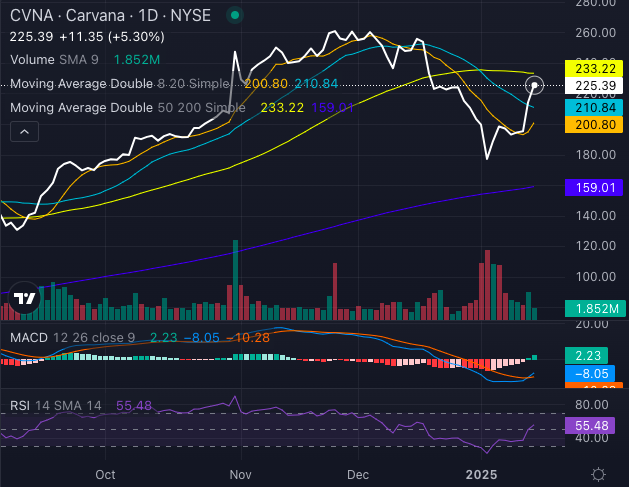 The online retailer, known for buying and selling used cars, is trading above its eight-day and 20-day simple moving averages (SMAs). This signals the potential for more upward momentum. The 50-day SMA, however, is waving a red flag with its bearish signal at $233.22. The 200-day SMA, way lower at $159.01, however infuses long-term optimism for Carvana stock.
