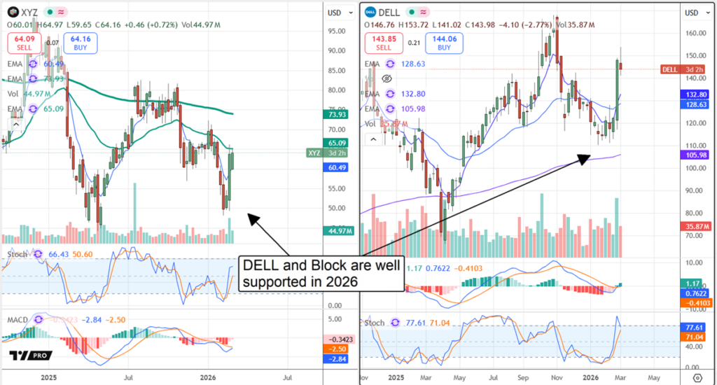 Gross margin is where this story begins. Gross margin is a measure of the underlying operation’s profitability, separating the cost of revenue from the actual product. In this case, Dell and Block both produce positive gross margins, are widening margins in 2026, outperforming expectations, and working to sustain and/or build on their strengths.