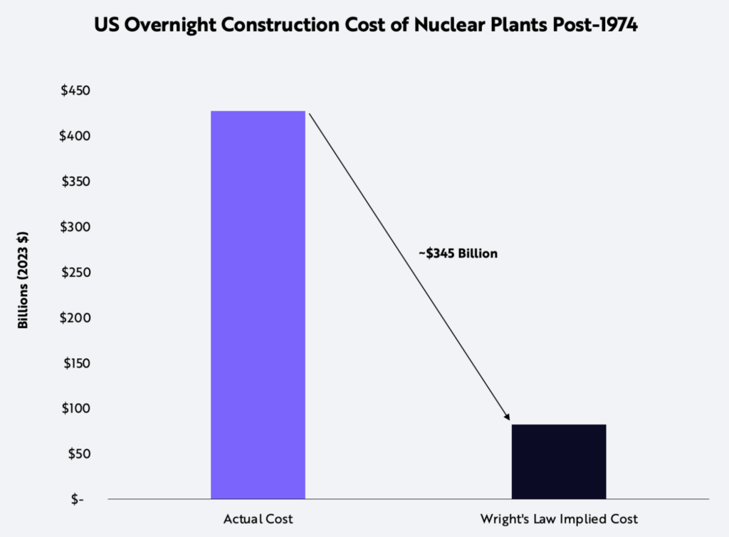 Regulatory changes in the mid-to-late seventies, including the establishment of the Nuclear Regulatory Commission and the Energy Research and Development Administration, introduced stricter licensing measures, increasing costs significantly. Without such stringent regulations, ARKInvest’s research suggests that lower cost trajectories could have saved the US about $345 billion, or ~72% of the total.
