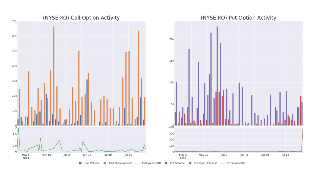 | KO | PUT | TRADE | BEARISH | 07/26/24 | $2.11 | $2.01 | $2.08 | $69.00 | $62.4K | 8 | 500 |