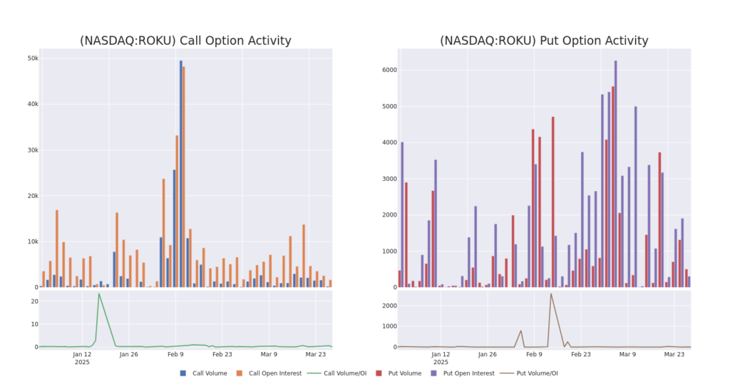 Assessing the volume and open interest is a strategic step in options trading. These metrics shed light on the liquidity and investor interest in Roku’s options at specified strike prices. The forthcoming data visualizes the fluctuation in volume and open interest for both calls and puts, linked to Roku’s substantial trades, within a strike price spectrum from $60.0 to $115.0 over the preceding 30 days.