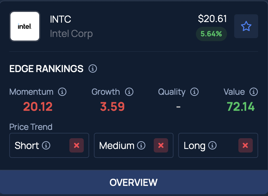 Intel earns a growth rating of 3.59% from Benzinga Edge Stock Rankings. Click here to compare its performance with TSMC, Nvidia, and other leading tech giants.