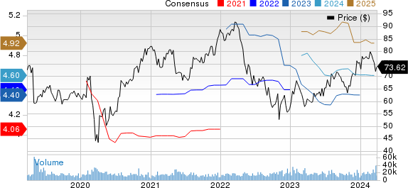 The consensus estimate for first-quarter 2024 earnings is $1.11 per share, unchanged over the past 30 days.