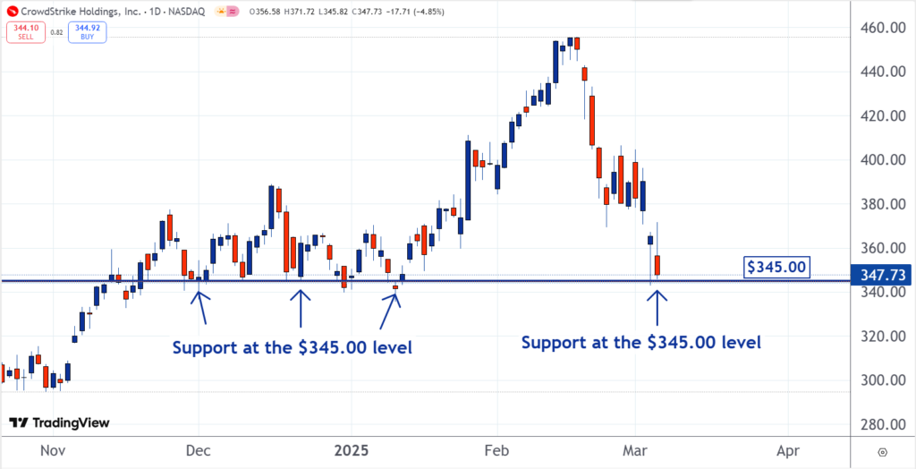 At support levels, there are as many or more shares to be bought than there are to sell. This is why downtrends end or pause when they reach them. As you can see on the chart, there has been support for CrowdStrike around $345.