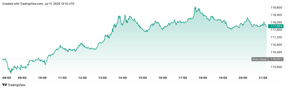 Bitcoin (BTC) is priced at US$118,008 a 6.3 percent increase in the last 24 hours. The day’s range for the cryptocurrency brought a low of US$110,768 and a high of US$118,667.